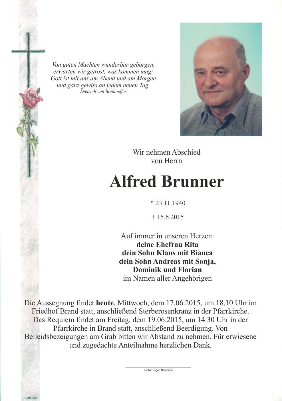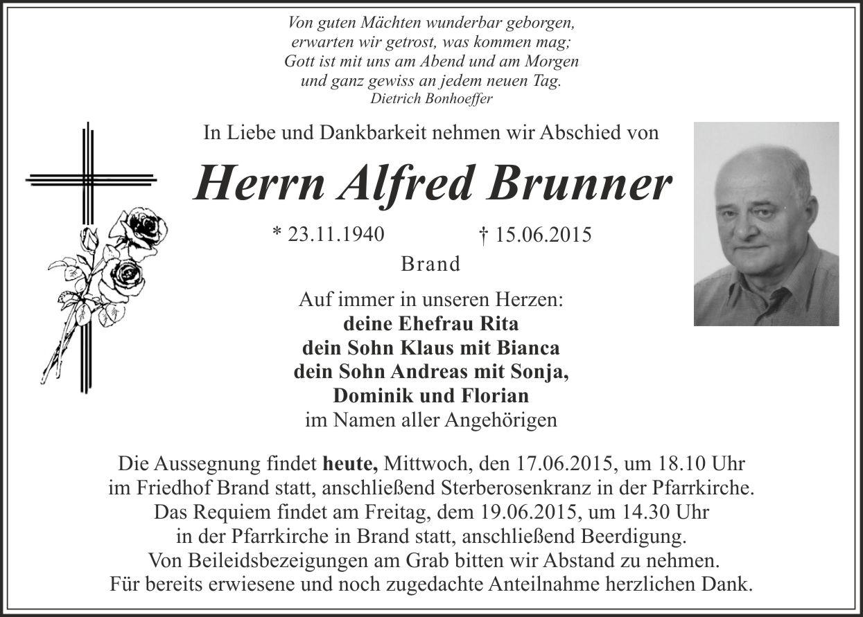 Aussegnung am Mittwoch, den 17.06.2015 um 18.10 Uhr im Friedhof Brand, anschließend Sterberosenkranz in der Pfarrkirche. Requiem am Freitag, den 19.06.2015 um 14.30 Uhr in der Pfarrkirche in Brand, anschließend Beerdigung. Von Beileidsbezeigungen am Grab bitten wir Abstand zu nehmen. Für bereits erwiesene und noch zugedachte Anteilnahme herzlichen Dank.