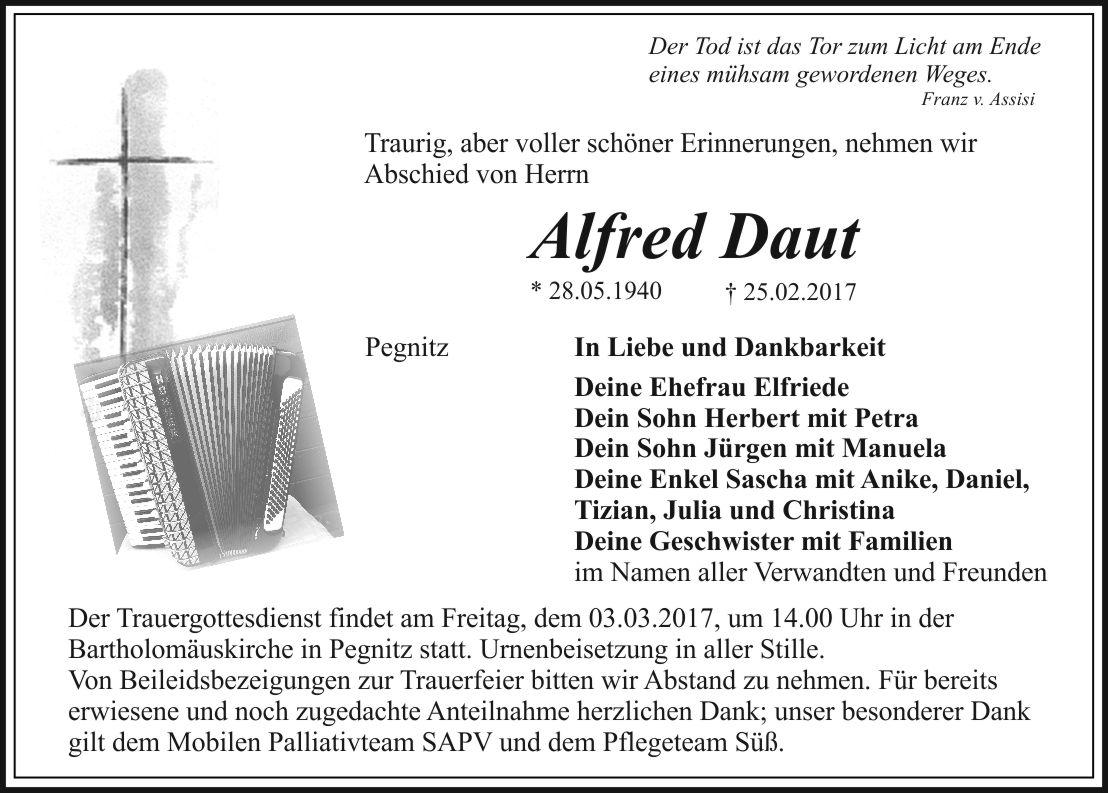 Der Trauergottesdienst findet am Freitag, den 03.03.2017, um 14.00 Uhr in der Bartholomäuskirche in Pegnitz statt. Urnenbeisetzung in aller Stille. Von Beileidsbezeigungen bitten wir Abstand zu nehmen. Für bereits erwiesene und noch zugedachte Anteilnahme herzlichen Dank. Unser besonderer Dank gilt dem Mobilen Palliativteam SAPV un dem Pflegeteam Süß.