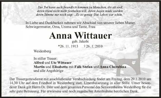Der Trauergottesdienst, mit anschließender Verabschiedung, findet am Freitag, den 29.1.2010 um 14.30 Uhr in der Stepfanskirche in Weidenberg statt. Urnenbeisetzung in aller Stille.