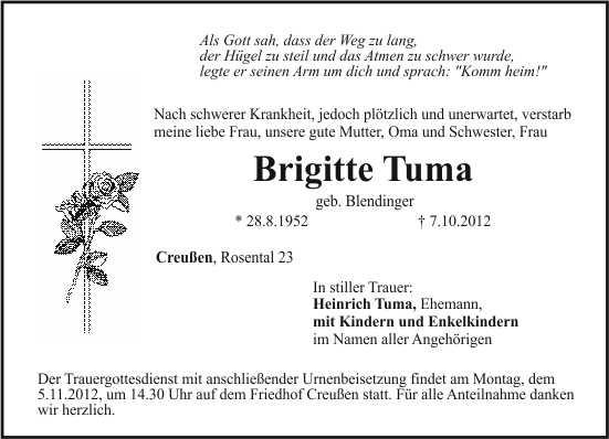 Der Trauergottesdienst mit anschließender Urnenbeisetzung findet am Montag, dem 5.11.2012, um 14.30 Uhr auf dem Friedhof Creußen statt. Für alle Anteilnahme danken wir herzlich.