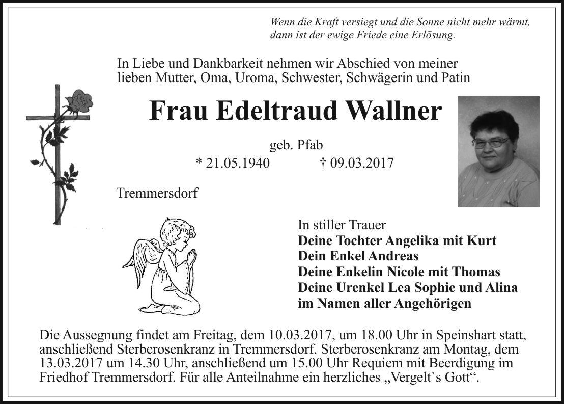 Die Aussegnung findet am Freitag, dem 10.03.2017, um 18.00 Uhr in Speinshart statt, anschließend Sterberosenkranz in Tremmersdorf. Sterberosenkranz am Montag, dem 13.03.2017 um 14.30 Uhr, anschließend um 15.00 Uhr Requiem mit Beerdigung im Friedhof Tremmersdorf. Für alle Anteilnahme ein herzliches „Vergelt`s Gott“.