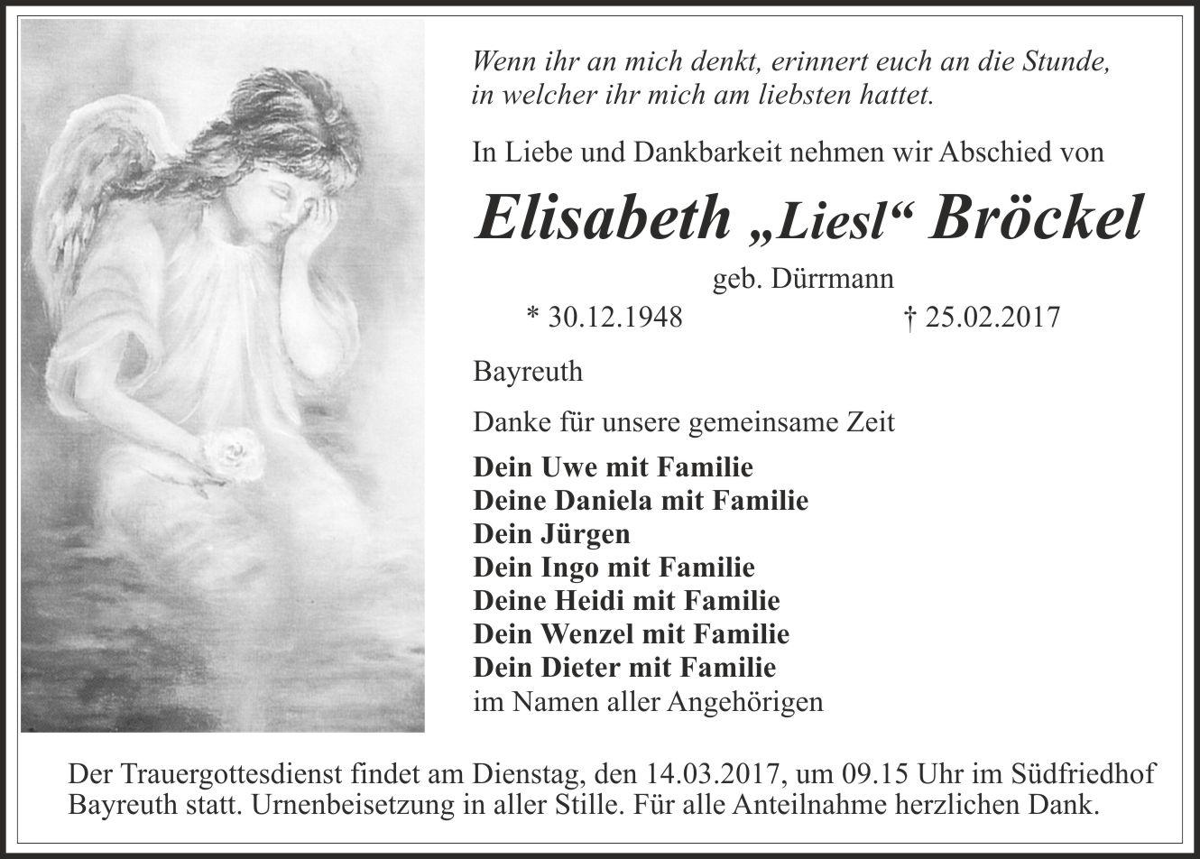 Die Trauerfeier findet am Dienstag, dem 14.03.2017, um 09.15 Uhr im Südfriedhof Bayreuth statt. Für alle Anteilnahme herzlichen Dank.