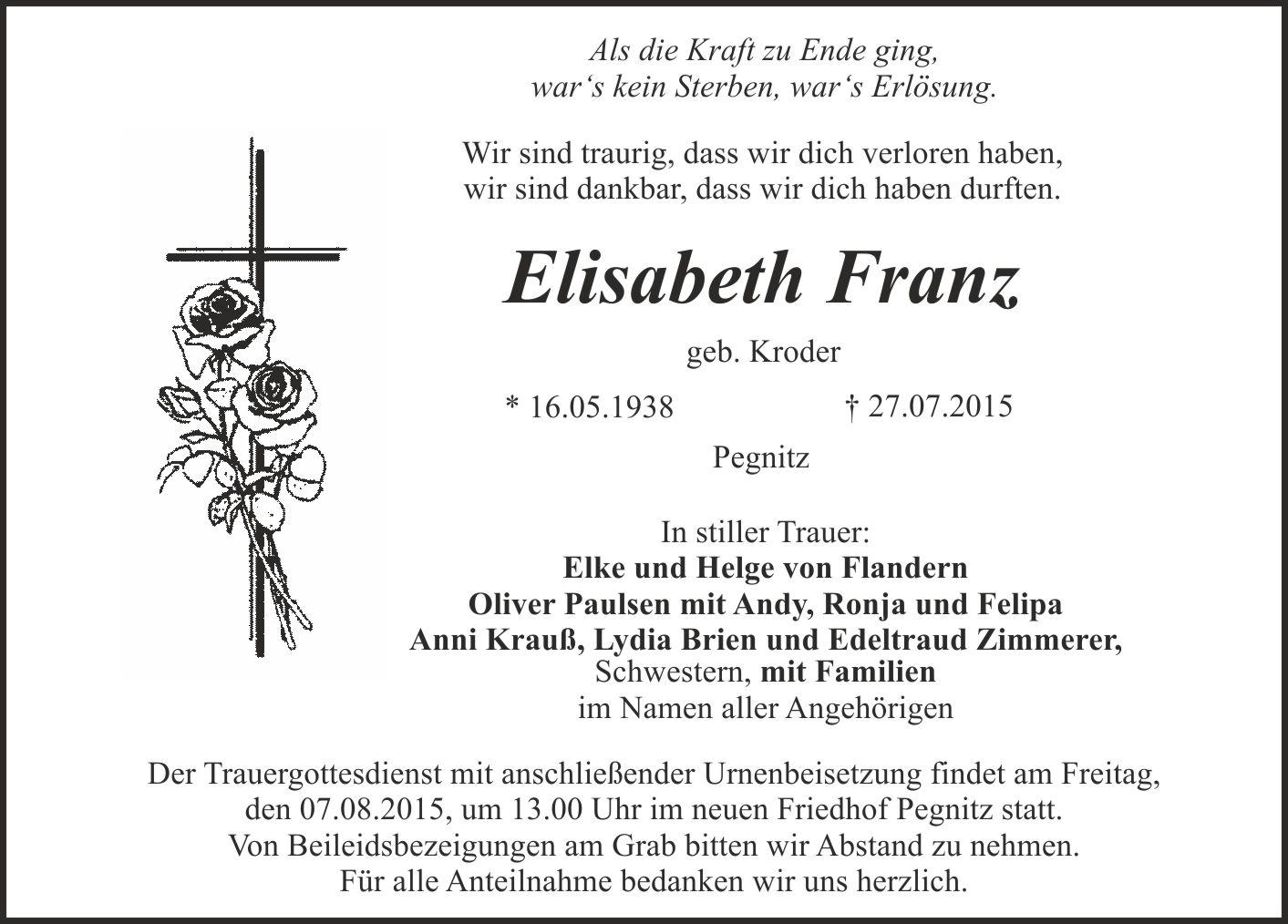 Der Trauergottesdienst mit anschließender Urnenbeisetzung findet am Freitag, den 07.08.2015 um 13.00 Uhr im neuen Friedhof Pegnitz statt. Von Beileidsbezeigungen am Grab bitten wir Abstand zu nehmen. Für alle Anteilnahme herzlichen Dank