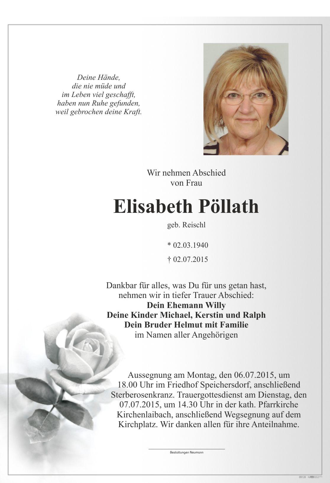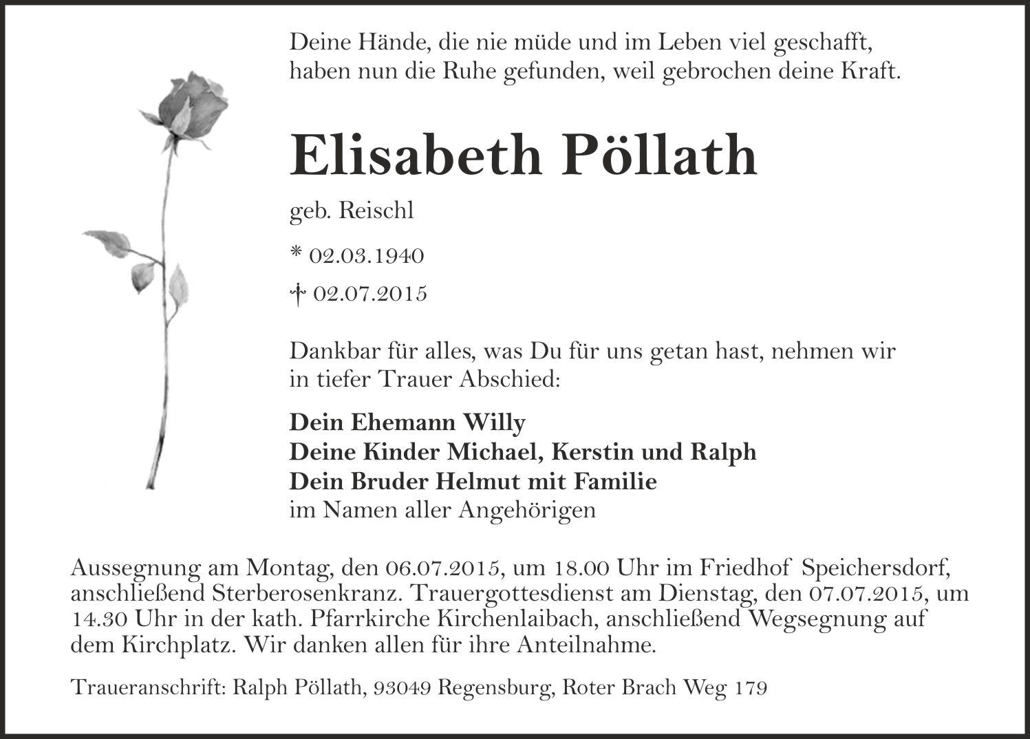 Requiem am Dienstag, den 07.07.2015 um 14.30 Uhr in der Katholischen Pfarrkirche Kirchenlaibach, anschließend Wegsegnung auf dem Kirchplatz. Urnenbeisetzung im Friedhof Speichersdorf im engsten Familienkreis. Für alle Anteilnahme herzlichen Dank.