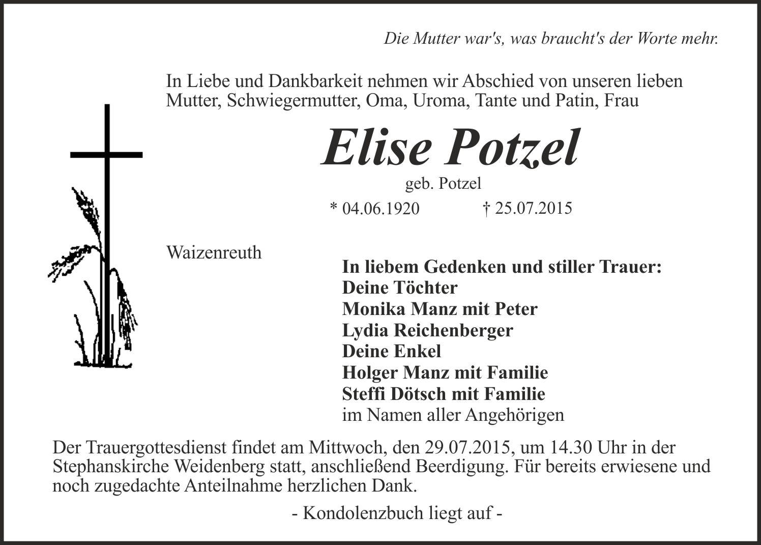 Der Trauergottesdienst mit anschließender Beerdigung findet am Mittwoch, den 29.07.2015 um 14.30 Uhr im Friedhof Weidenberg statt. Für alle Anteilnahme herzlichen Dank. - Kondolenzbuch liegt auf -