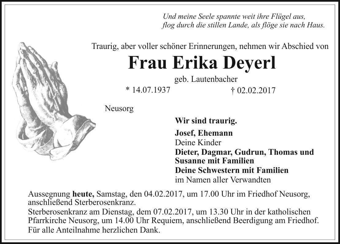 Sterberosenkranz am Dienstag, dem 07.02.2017, um 13.30 Uhr in der katholischen Pfarrkirche Neusorg, um 14.00 Uhr Requiem, anschließend Beerdigung am Friedhof. Für alle Anteilnahme herzlichen Dank.
