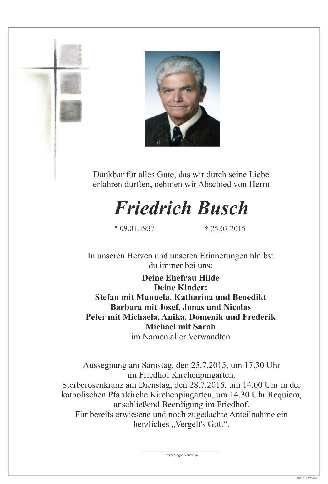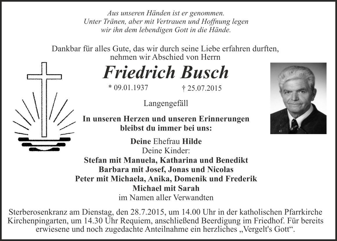 Sterberosenkranz am Dienstag, den 28.07.2015 um 14.00 Uhr in der katholischen Pfarrkirche Kirchenpingarten, um 14.30 Uhr Requiem, anschließend Beerdigung im Friedhof. Für bereits erwiesene und noch zugedachte Anteilnahme ein herzliches "Vergelt's Gott".