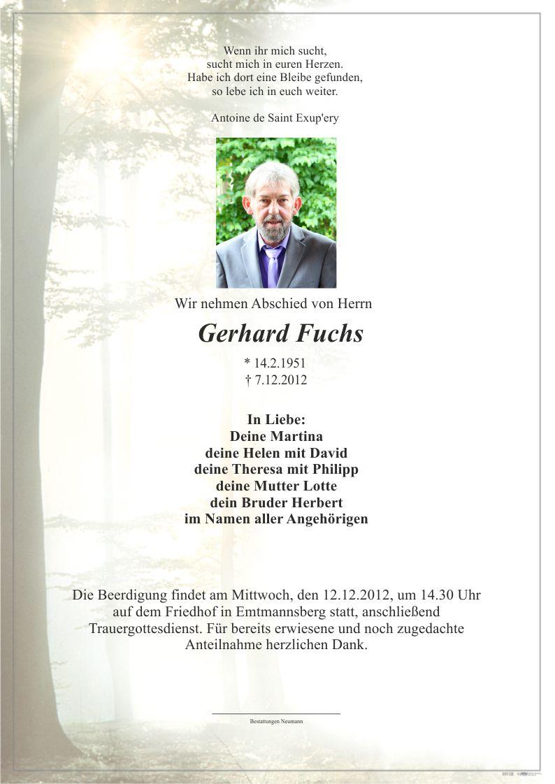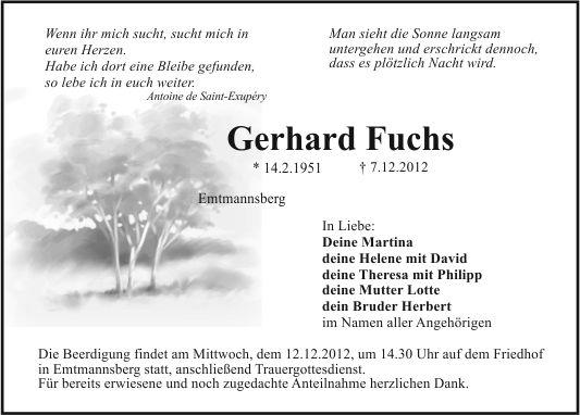 Die Beerdigung findet am Mittwoch, den 12.12.2012, um 14.30 Uhr auf dem Friedhof in Emtmannsberg statt, anschließend Trauergottesdienst. Für bereits erwiesene und noch zugedachte Anteilnahme herzlichen Dank.