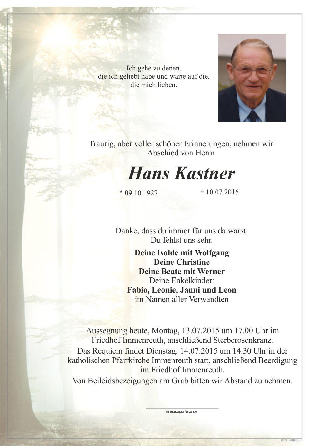 Aussegnung Montag, 13.07.2015 um 17.00 Uhr im Friedhof Immenreuth, anschließend Sterberosenkranz. Requiem am Dienstag, den 14.07.2015 um 14.30 Uhr in der katholischen Pfarrkirche Immenreuth, anschließend Beerdigung im Friedhof. Von Beileidsbezeigungen am Grab bitten wir Abstand zu nehmen.