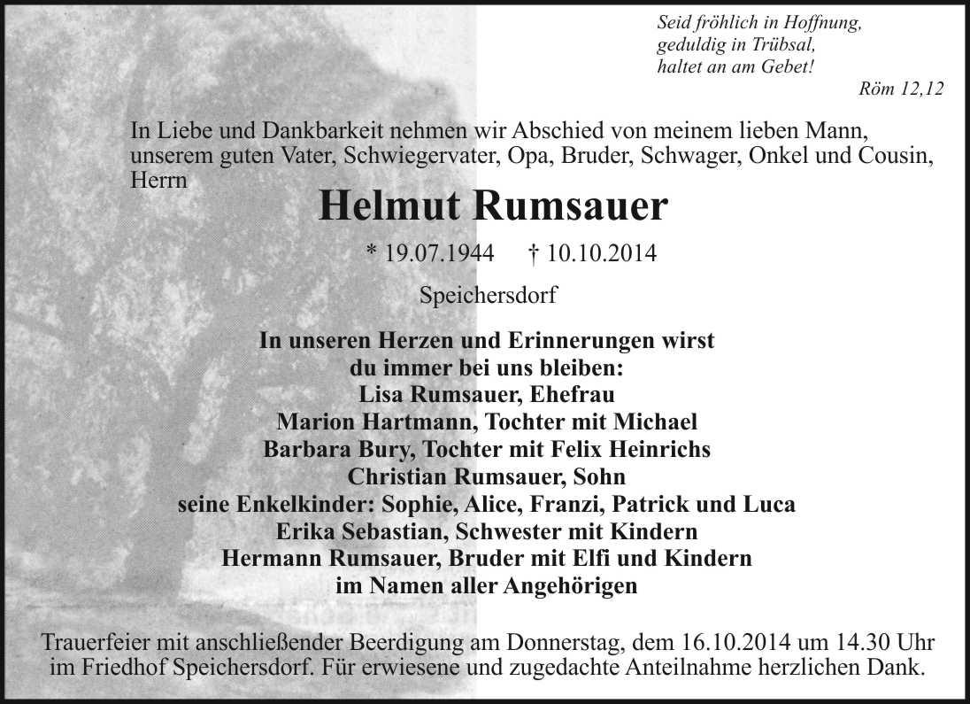 Trauerfeier mit anschließender Beerdigung am Donnerstag, dem 16.10.2014 um 14.30 Uhr im Friedhof Speichersdorf. Für erwiesene und zugedachte Anteilnahme herzlichen Dank.