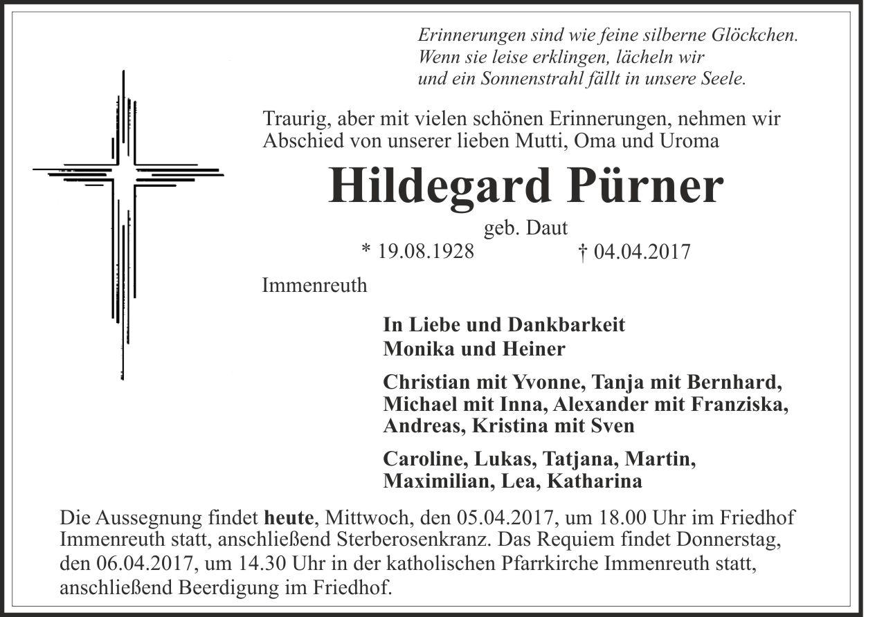 Aussegnung am Mittwoch, dem 05.04.2017, um 18.00 Uhr im Friedhof Immenreuth, anschließend Sterberosenkranz. Requiem am Donnerstag, dem 06.04.2017, um 14.30 Uhr in der katholischen Pfarrkirche Immenreuth, anschließend Beerdigung. Für alle Anteilnahme herzlichen Dank.