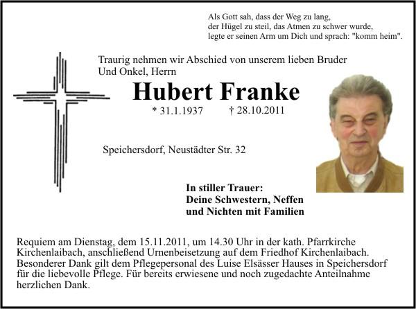 Requiem am Dienstag, dem 15.11.2011, um 14.30 Uhr in der kath. Pfarrkirche Kirchenlaibach, anschließend Urnenbeisetzung auf dem Friedhof Kirchenlaibach. Besonderer Dank gilt dem Pflegepersonal des Luise Elsässer Hauses in Speichersdorf für die liebevolle Pflege. Für bereits erwiesene und noch zugedachte Anteilnahme herzlichen Dank.