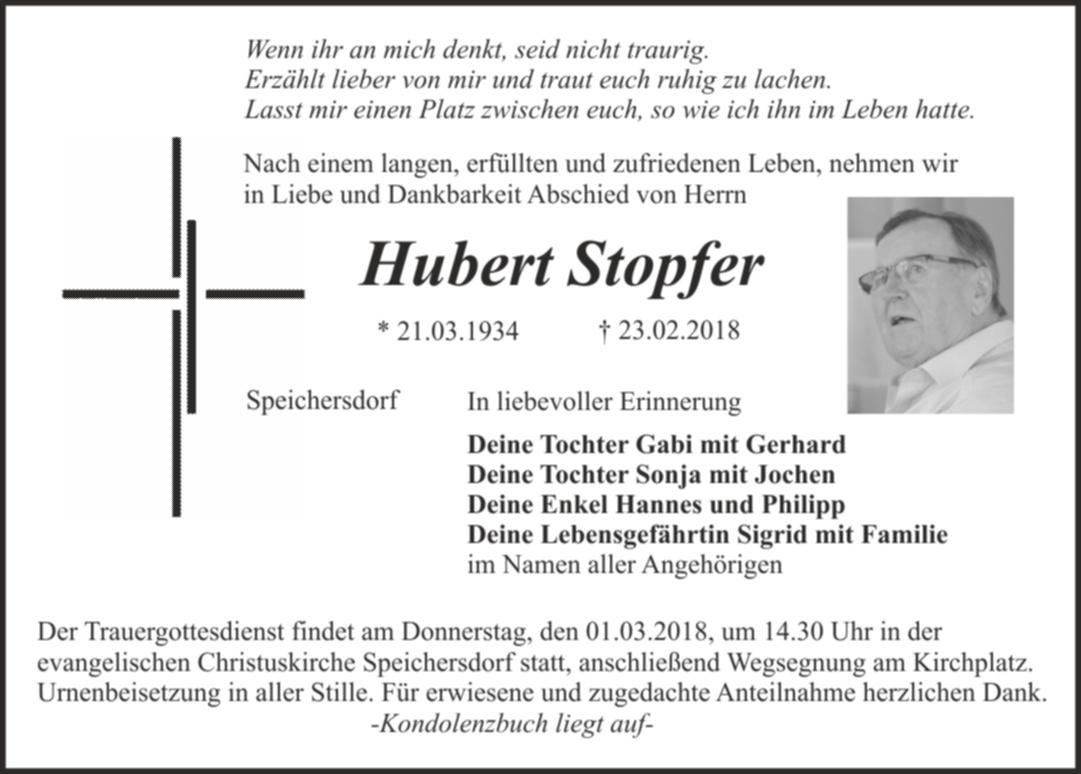 Der Trauergottesdienst findet am Donnerstag, den 01.03.2018, um 14.30 Uhr in der evangelischen Christuskirche Speichersdorf statt, anschließend Wegsegnung auf dem Kirchplatz. Urnenbeisetzung in aller Stille. Für erwiesene und zugedachte Anteilnahme herzlichen Dank. - Kondolenzbuch liegt auf -