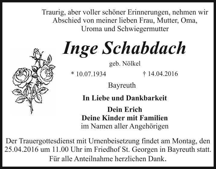 Der Trauergottesdienst mit Urnenbeisetzung findet am Montag, den 25.04.2016 um 11.00 Uhr im Friedhof St. Georgen in Bayreuth statt.