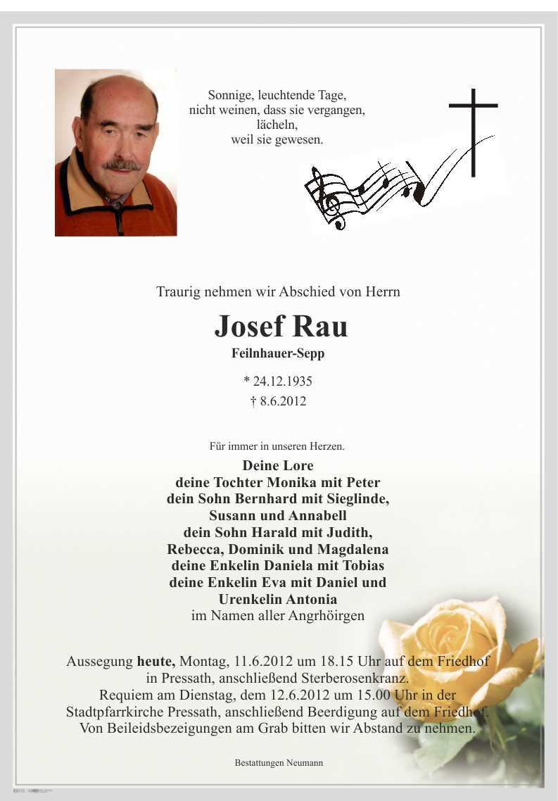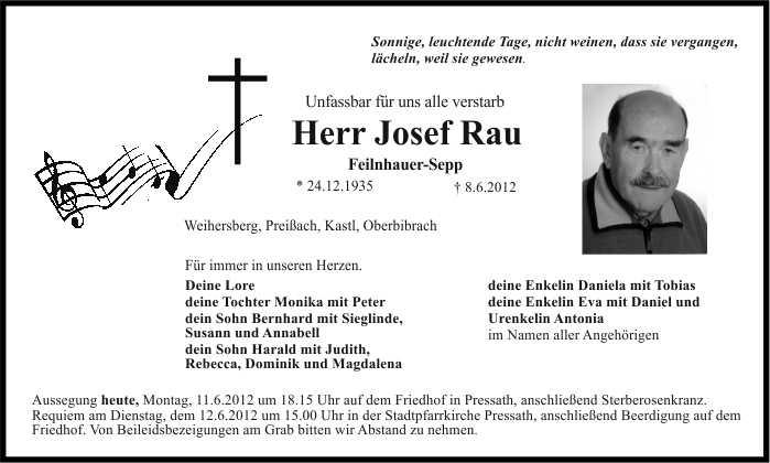Aussegung heute, Montag, 11.6.2012 um 18.15 Uhr auf dem Friedhof in Pressath, anschließend Sterberosenkranz. Requiem am Dienstag, dem 12.6.2012 um 15.00 Uhr in der Stadtpfarrkirche Pressath, anschließend Beerdigung auf dem Friedhof. Von Beileidsbezeigungen am Grab bitten wir Abstand zu nehmen.