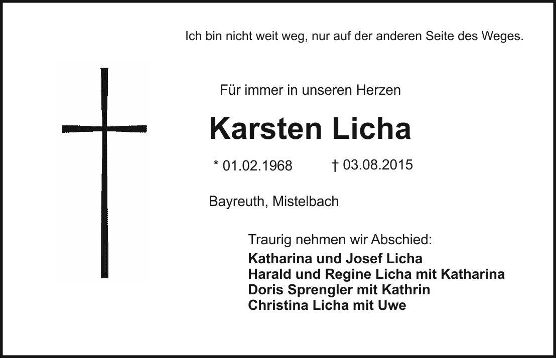 Der Trauergottesdienst findet am Freitag, den 07.08.2015, um 14.15 Uhr in der evangelischen Pfarrkirche Mistelbach statt, anschließend Wegsegnung am Kirchplatz. Von Beileidsbezeigungen zur Trauerfeier bitten wir Abstand zu nehmen. Für bereits erwiesene und noch zugedachte Anteilnahme herzlichen Dank. Anstelle von Kranz-und Blumengaben bitten wir um eine Spende zugunsten der Palliativstation des Klinikums Bayreuth, BLZ: 773 501 10, Konto: 210 210 92 unter dem Kennwort: Karsten Licha.