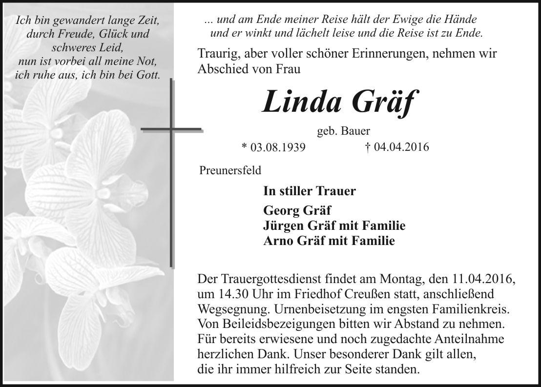 Der Trauergottesdienst findet am Montag, den 11.04.2016 um 14.30 Uhr im Friedhof Creußen statt, anschließend Wegsegnung. Urnenbeisetzung im engsten Familienkreis.