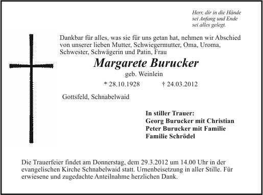 Die Trauerfeier findet am Donnerstag, dem 29.3.2012 um 14.00 Uhr in der evangelischen Kirche Schnabelwaid statt. Urnenbeisetzung in aller Stille. Für erwiesene und zugedachte Anteilnahme herzlichen Dank.