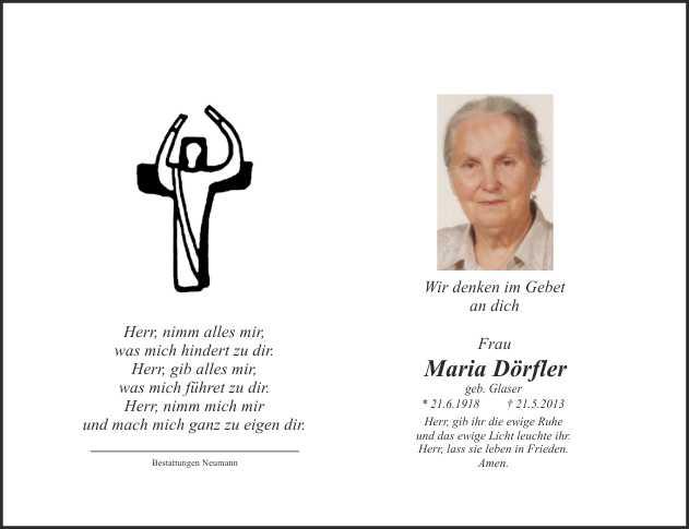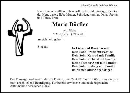 Der Trauergottesdienst findet am Freitag, dem 24.5.2013 um 14.00 Uhr in Stockau statt, anschließend Beerdigung. Für bereits erwiesene und noch zugedachte Anteilnahme herzlichen Dank.