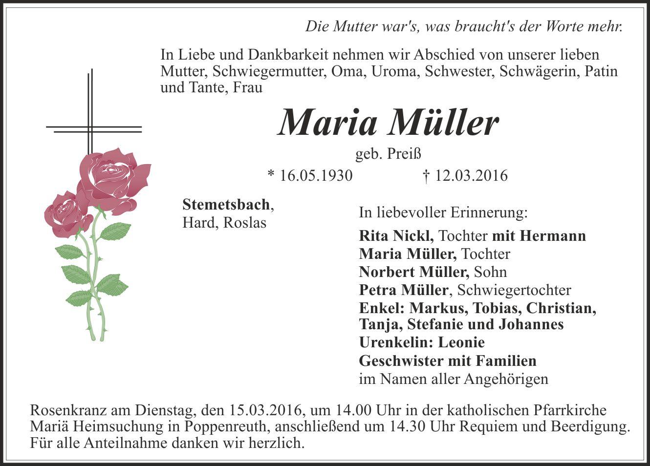 Rosenkranz am Dienstag, den 15.03.2016, um 14.00 Uhr in der katholischen Pfarrkirche Mariä Heimsuchung in Poppenreuth, anschließend um 14.30 Uhr Requiem und Beerdigung. Für alle Anteilnahme herzlichen Dank.