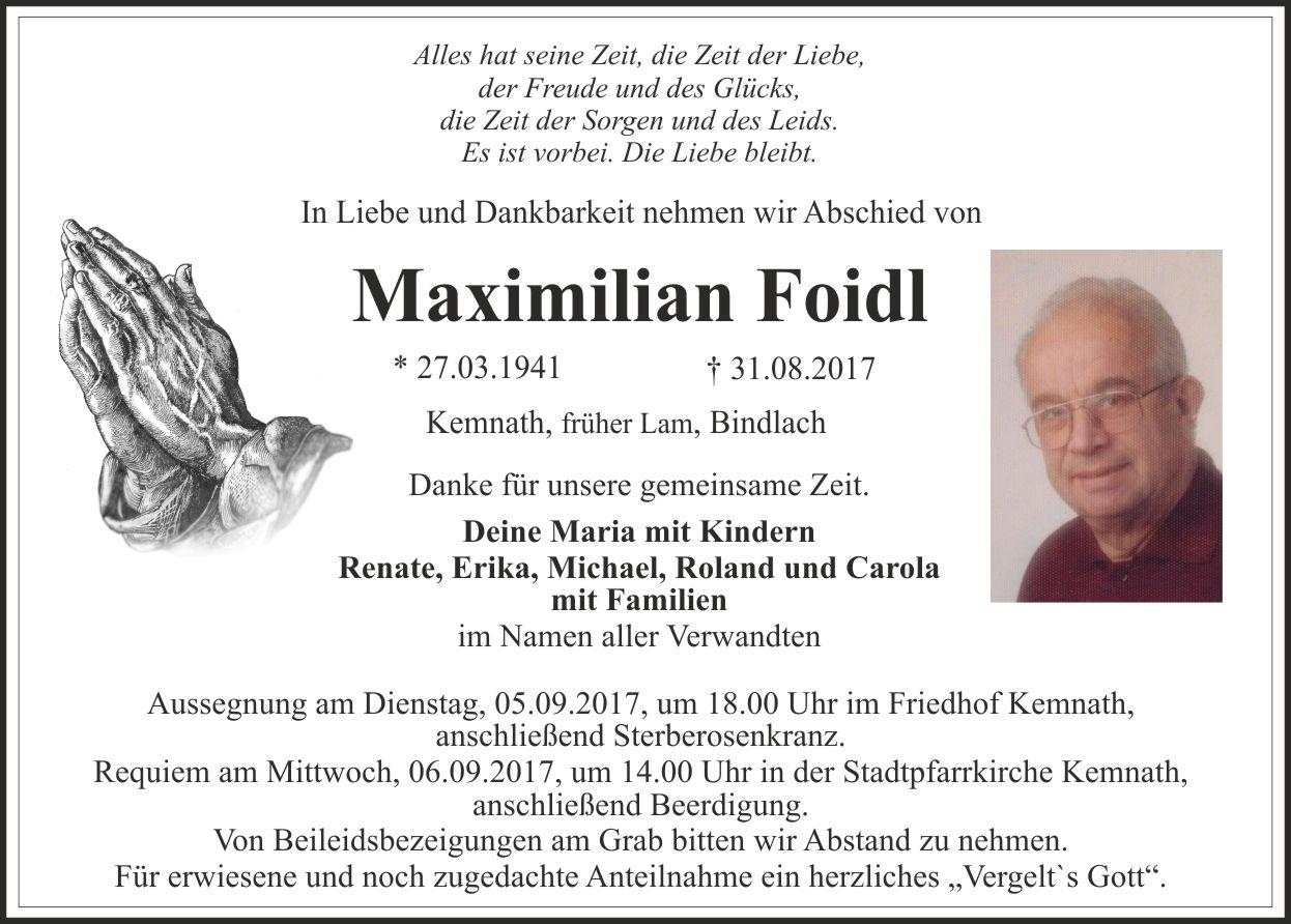 Requiem am Mittwoch, 06.09.2017, um 14.00 Uhr in der Stadtpfarrkirche Kemnath, anschließend Beerdigung.
