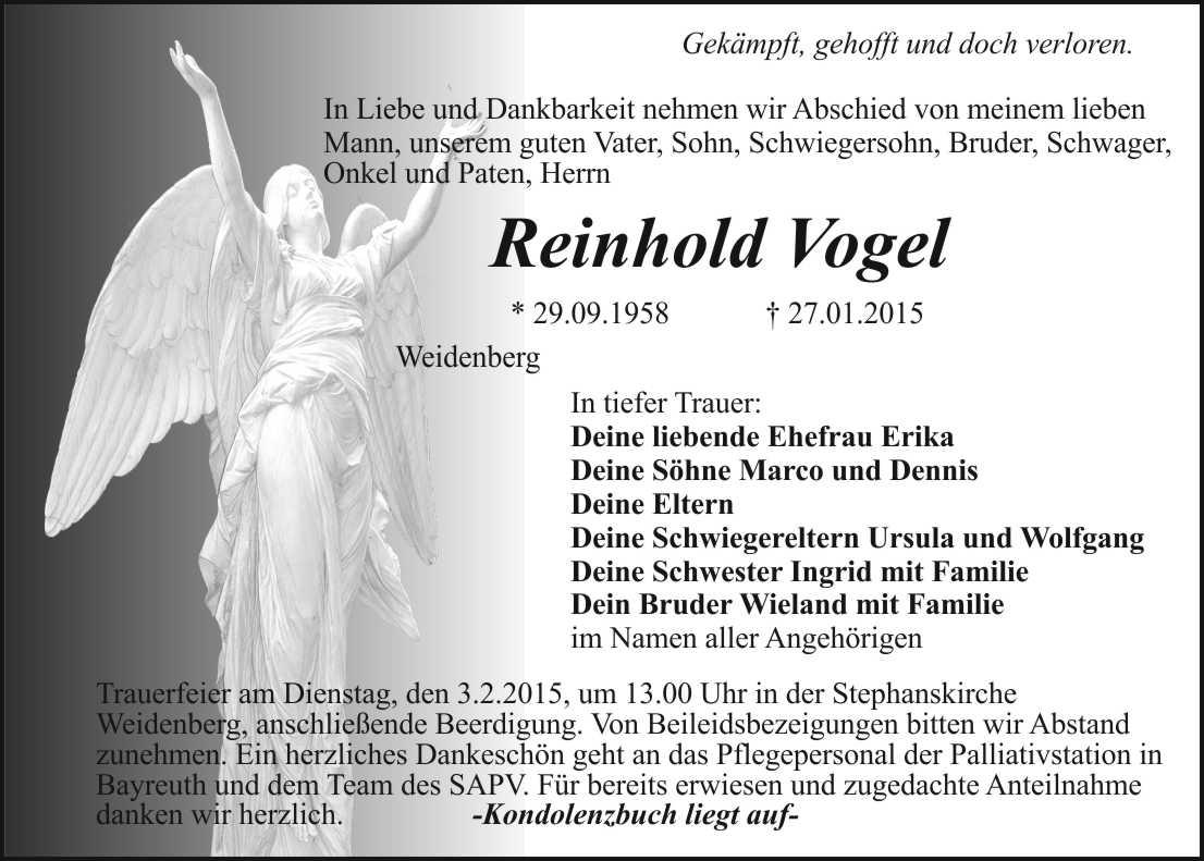 Trauerfeier am Dienstag, den 3.2.2015, um 13.00 Uhr in der Stephanskirche Weidenberg, anschließende Beerdigung. Von Beileidsbezeigungen bitten wir Abstand zunehmen. Ein herzliches Dankeschön geht an das Pflegepersonal der Palliativstation in Bayreuth und dem Team des SAPV. Für bereits erwiesen und zugedachte Anteilnahme danken wir herzlich. -Kondolenzbuch liegt auf-