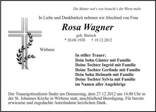 Der Trauergottesdienst findet am Donnerstag, dem 27.12.2012 um 14.00 Uhr in der St. Johannes Kirche in Wirbenz statt, anschließend Beerdigung. Für bereits erwiesene und zugedachte Anteilnahme herzlichen Dank.