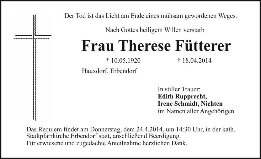 Das Requiem findet am Donnerstag, dem 24.4.2014, um 14:30 Uhr, in der kath. Stadtpfarrkirche Erbendorf statt, anschließend Beerdigung.