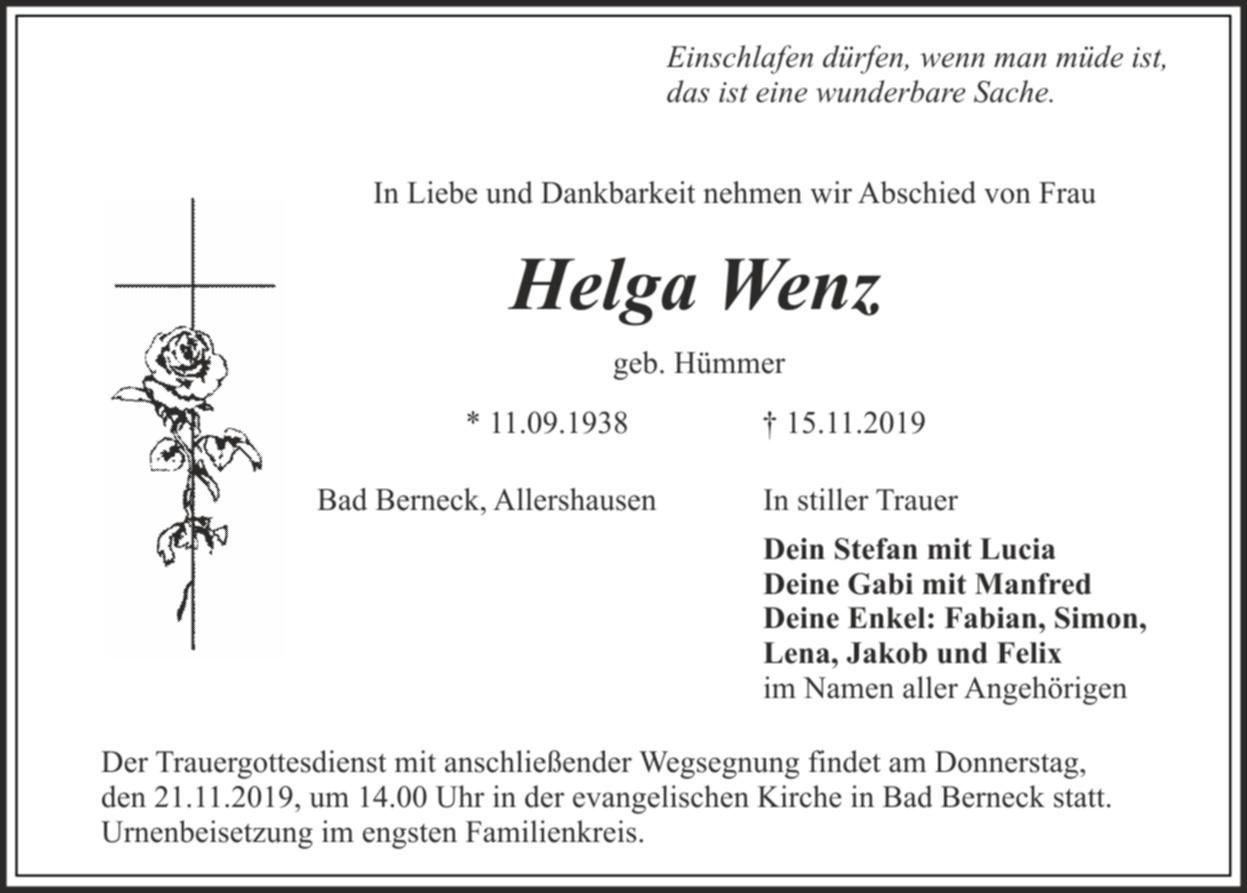 Der Trauergottesdienst mit anschließender Wegsegnung findet am Donnerstag, den 21.11.2019, um 14.00 Uhr in der evangelischen Kirche in Bad Berneck statt.