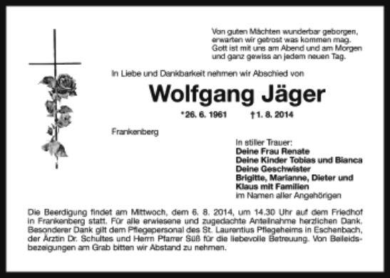 Die Beerdigung mit anschließendem Trauergottesdienst findet am Mittwoch, den 6.8.2014 um 14.30 Uhr in Frankenberg statt. Für alle Anteilnahme herzlichen Dank.
